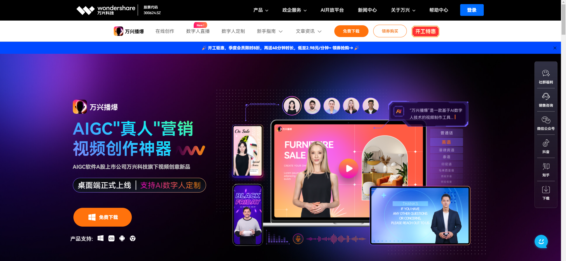 万兴播爆作为一款免费的AI数字人短视频直播带货工具,以其强大的功能、丰富的素材库和一键生成的便捷性,为用户带来了全新的营销和创作体验。无论是电商平台卖家、个人自媒体还是企业品牌,都能通过万兴播爆轻松打造出高质量的短视频内容,实现有效的产品推广和品牌宣传。