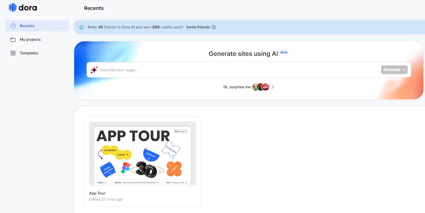 在dora AI平台上,用户既可以选择系统随机生成的提示词,也可以自行输入特定文本,让AI根据需求生成相应的网站内容。平台支持多种类型的网站开发,包括商务、科技、营销等,满足不同领域用户的个性化需求。