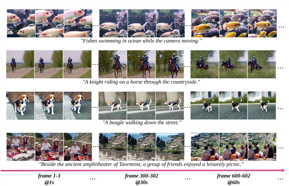 在测试中,研究人员利用StreamingT2V技术成功生成了长达1200帧、约2分钟的视频。这一成果不仅展示了StreamingT2V技术在视频生成方面的强大能力,也证明了其在处理复杂动态场景和保持时间一致性方面的卓越表现。