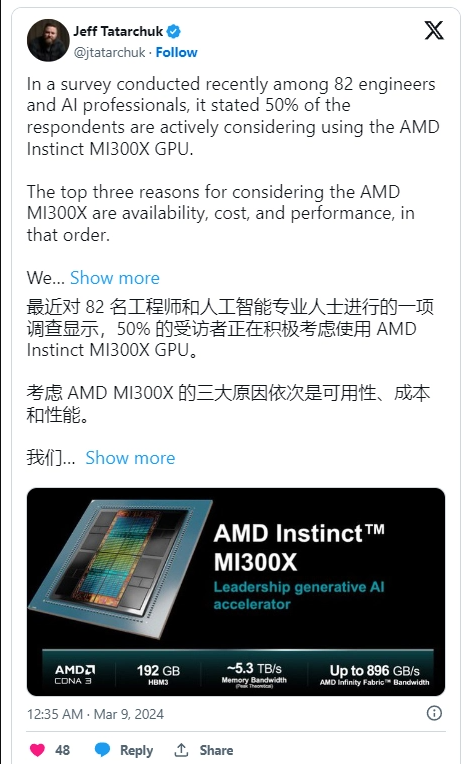 AI旋风了解到,TensorWave联合创始人Jeff Tatarchuk近日透露了一项独立调查结果。这项调查涵盖了82名工程师和人工智能领域的专业人士,其中约有一半的受访者表示对AMD Instinct MI300X GPU充满信心。他们认为,相比英伟达的H100系列产品,MI300X不仅性价比更为出色,而且供应充足,有效避免了货源紧张的问题。TensorWave公司也计划采用MI300X人工智能加速器,这无疑为AMD的人工智能芯片业务注入了新的活力。