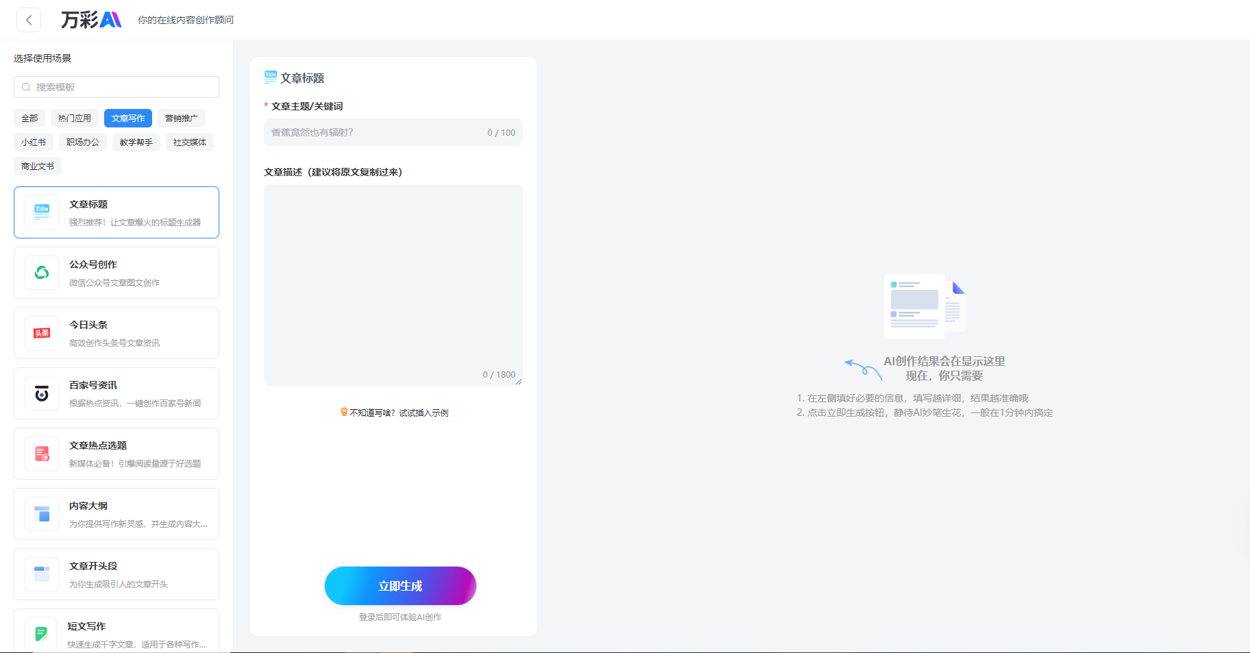 - 多领域适用:万彩AI的应用领域非常广泛,适用于课程制作、广告策划、编辑出版、自媒体运营等多个领域。无论你是内容创作者、营销人员还是普通用户,万彩AI都能为你提供便利的文案解决方案,帮助你快速生成高质量的内容。