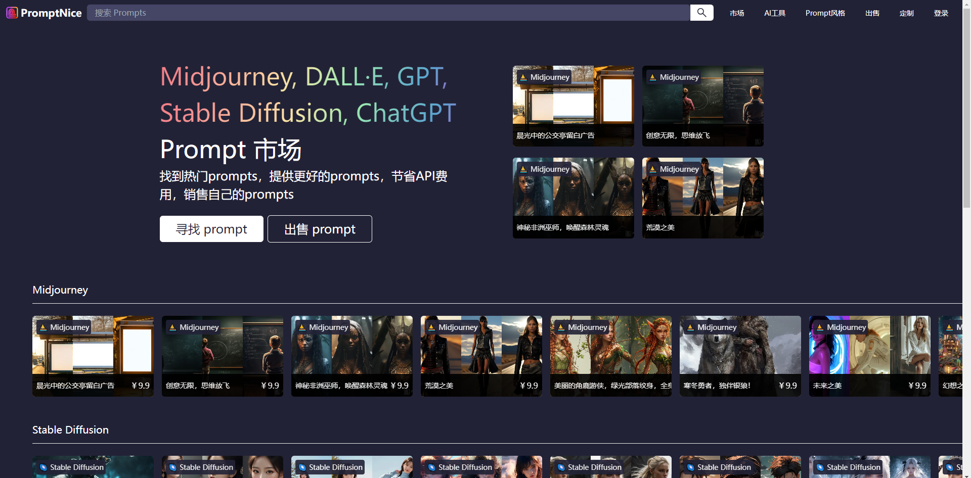 PromptNice,如其名所示,是一个集AI绘画和聊天提示词交易于一体的平台。它为用户提供了一个丰富的提示词库,涵盖了Midjourney、Stable Diffusion、DALL·E等多种AI模型,使得用户可以轻松找到与自己创作需求相匹配的素材。无论是想要生成一幅精美的画作,还是寻找一段富有创意的聊天提示词,PromptNice都能满足你的需求。