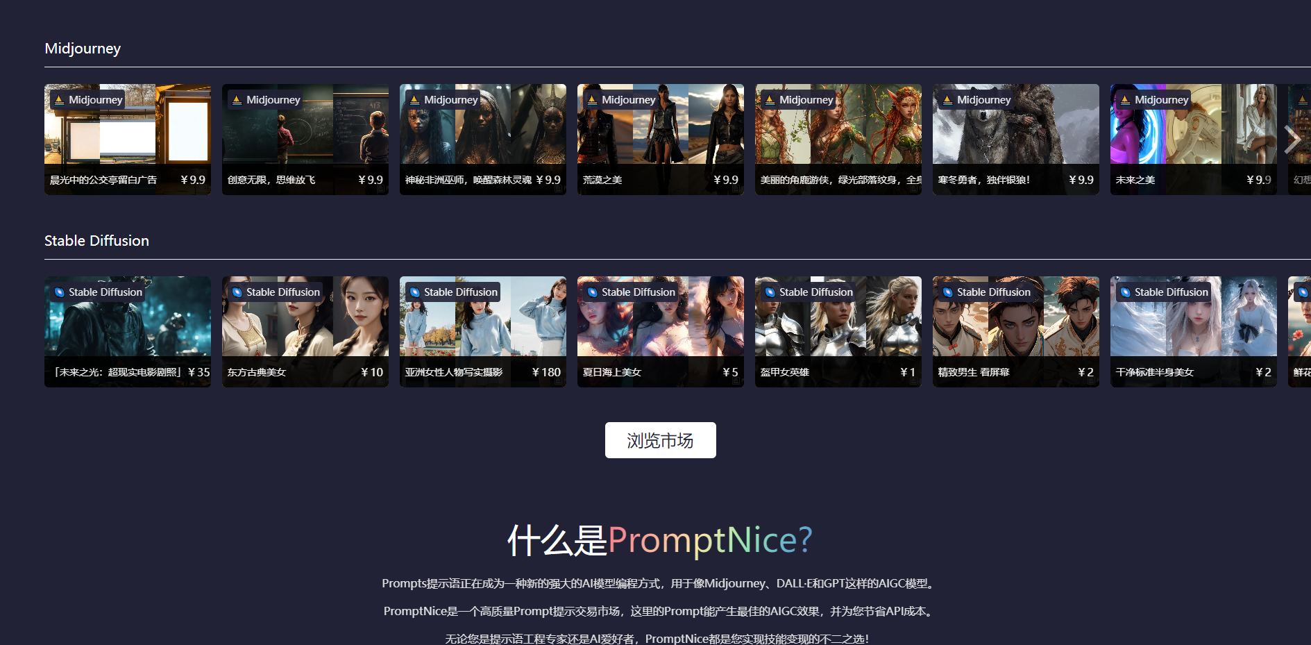 除了提示词查找功能,PromptNice还为用户提供了一个创新的提示词交易市场。在这个市场上,用户不仅可以购买到其他人发布的优秀提示词,还可以将自己创作的提示词进行出售。这种交易模式不仅为创作者提供了更多的变现机会,同时也为其他用户提供了更多的选择和参考。在这个市场上,你可以发现许多独特的创意和灵感,为你的创作之旅增添更多色彩。