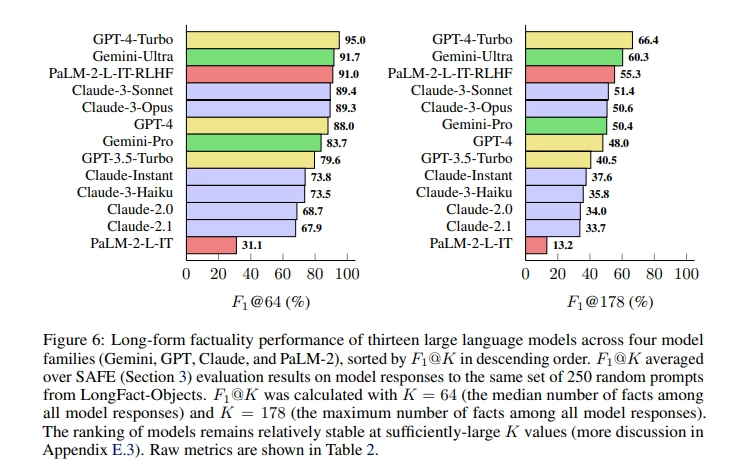为了确保SAFE工具的性能达到最佳状态,研究人员精心创建了一个包含约16000个事实的数据集LongFact。同时,他们还在来自Claude、Gemini、GPT、PaLM-2等13个大语言模型上对该系统进行了全面测试。令人振奋的是,在对100个有争议的事实进行的重点分析中,SAFE的判定在进一步审查下正确率达到了惊人的76%。