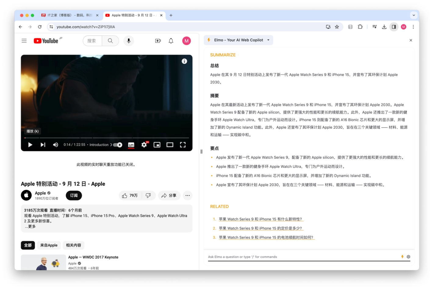 为了验证Elmo的实际效果,贾扬清团队对长达1小时22分的苹果2023秋季发布会视频进行了测试。令人惊讶的是,Elmo仅用时几秒便为这段视频生成了中文的总结、摘要和亮点,甚至还包括了相关问答的链接。这一成果充分展示了Elmo在处理复杂视频内容时的卓越性能。