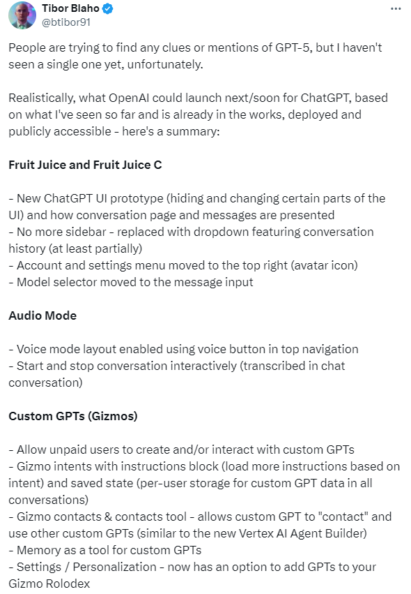近日,知名博主Tibor Blaho在推特上曝光了ChatGPT即将更新的一系列新功能和改进,引发了科技圈的广泛关注。尽管关于GPT-5的具体信息仍然笼罩在神秘面纱之下,但OpenAI显然已经在为ChatGPT的下一步发展做好了准备。这些新功能不仅优化了用户体验,还赋予了免费用户更多创建和交互自定义GPT的能力,让GPT Plus的地位面临挑战。