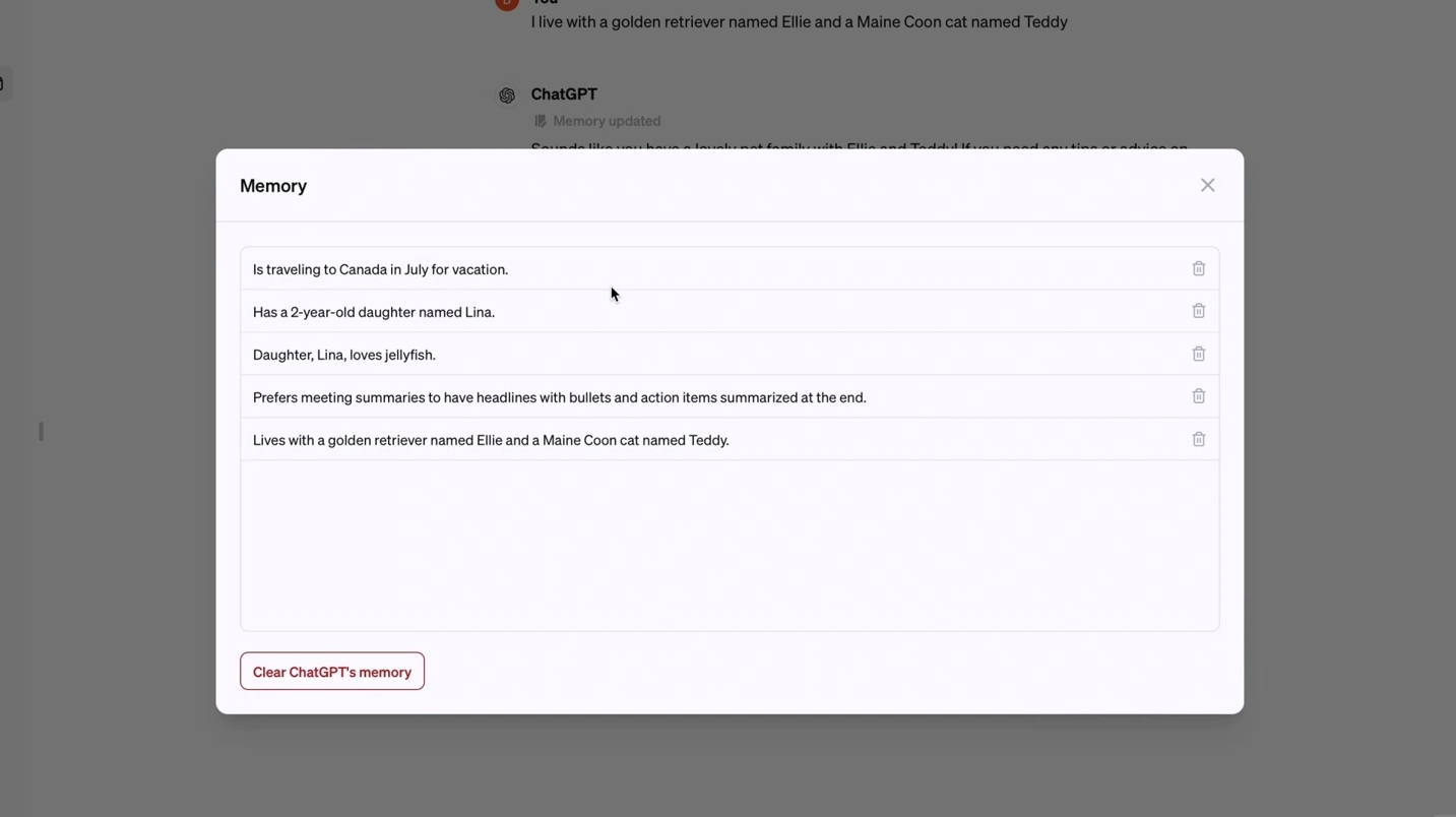 OpenAI在新闻稿中列举了几个具体的场景示例,展示了ChatGPT记忆功能的实际应用。例如,当用户习惯在会议记录的底部总结标题、要点和行动项目时,ChatGPT会记住这一偏好,并在后续的会议记录中自动采用相同的格式。当用户告诉ChatGPT自己开了一家咖啡店时,ChatGPT在帮助用户策划庆祝新店开张的社交帖子时,会知道该从哪里入手。此外,当用户提到自己有一个蹒跚学步的孩子,并且孩子喜欢水母时,ChatGPT在帮助用户制作生日贺卡时,会建议制作一个戴着派对帽子的水母图案。这些示例充分展示了ChatGPT记忆功能的强大和灵活。