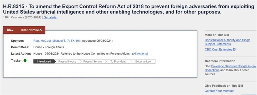 近日,科技界掀起了一阵波澜。5月8日,美国联邦众议院外交事务委员会主席Michael McCaul联合其他三位众议院代表,共同提出了第118届国会H.R.8315法案,这一法案旨在进一步修订《2018年出口管制改革法案》(ECRA),加强对人工智能(AI)大模型及相关技术的出口管制,防止包括中国在内的外国竞争对手开发和利用这些关键技术。