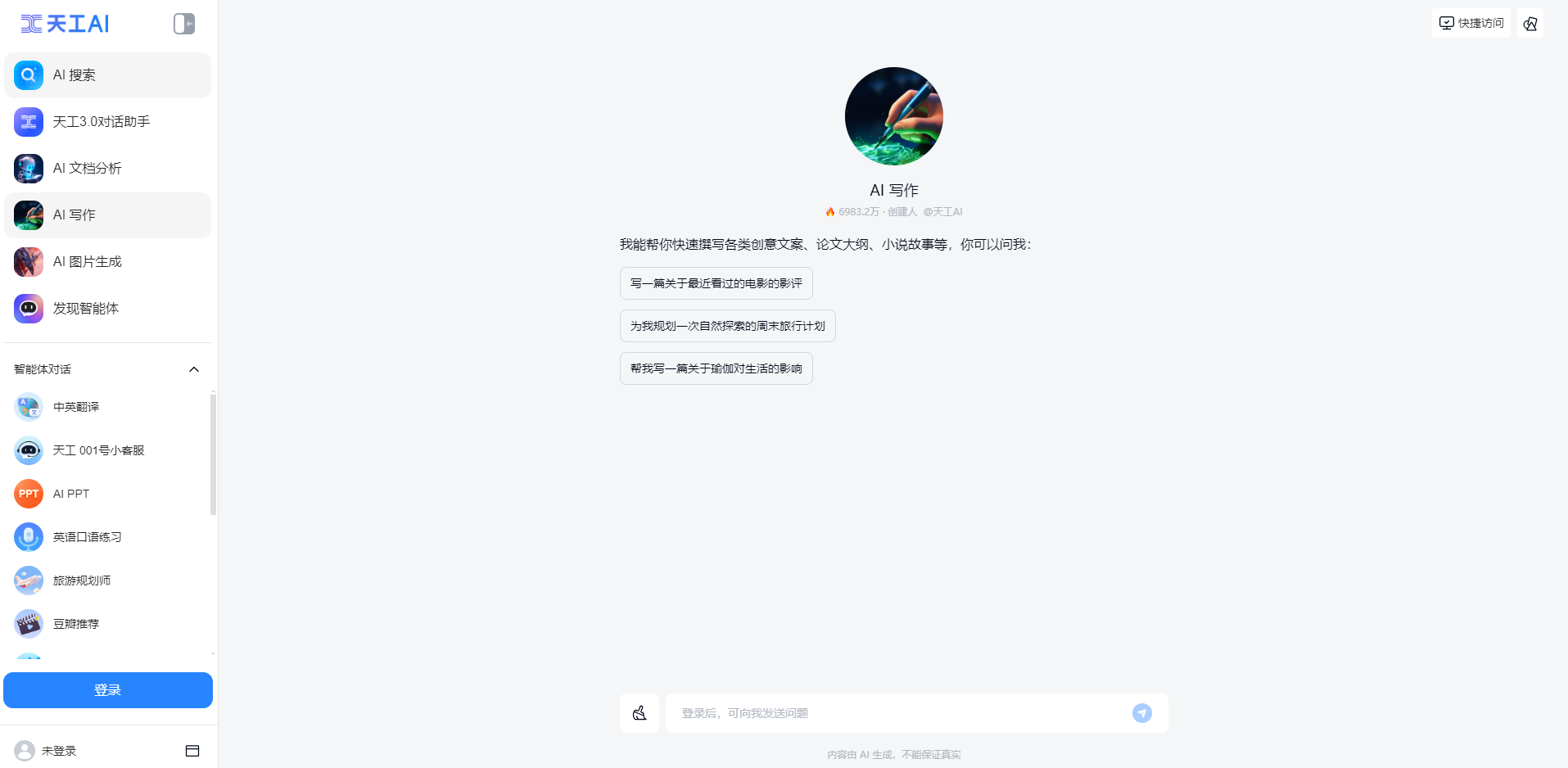 天工AI作为一款免费的AI助手,大大降低了用户的使用门槛。用户无需支付任何费用,即可享受到天工AI提供的全面而强大的自然语言处理功能。这种免费使用的特点使得天工AI更加亲民和普及化,让更多的人能够体验到AI技术带来的便利和乐趣。