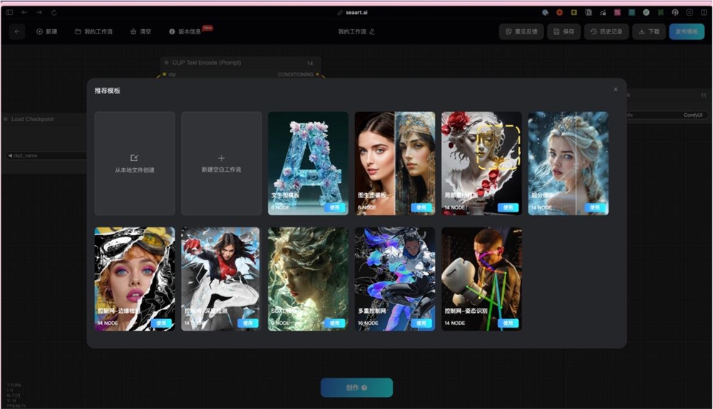 据悉,海艺对Comfyui进行了深度定制,确保用户体验的流畅与高效。用户在使用Comfyui云端服务时,可以轻松选择新建工作流,并基于平台提供的通用模板进行改进。这种基于模板的创建方式,极大地简化了工作流的设计过程,使用户能够更快速地构建出符合自身需求的工作流。