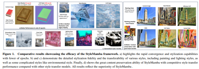研究团队在总结StyleMamba的主要贡献时强调,该模型通过将条件Mamba整合到AutoEncoder架构中,构建了一个简单而强大的框架。这种整合使得文本驱动的风格转移过程更加快速和高效,简化了与当前方法的比较。此外,StyleMamba利用损失函数来提高风格化质量,确保全局和局部风格的一致性,同时不损害图像的原始内容,进一步加快了风格化过程。