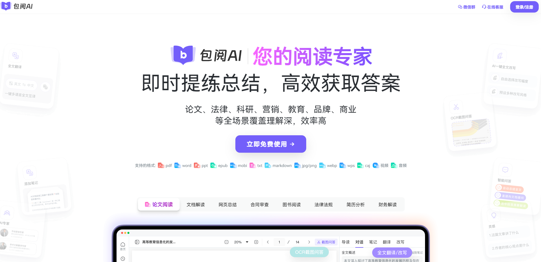 包阅AI不仅适用于网页阅读、论文文献等场景,还能满足法律文档、学术科研、产品手册、市场报告、电子书等众多内容的阅读需求。无论我们是从事哪个行业或领域的工作,包阅AI都能为我们提供全方位的阅读支持。