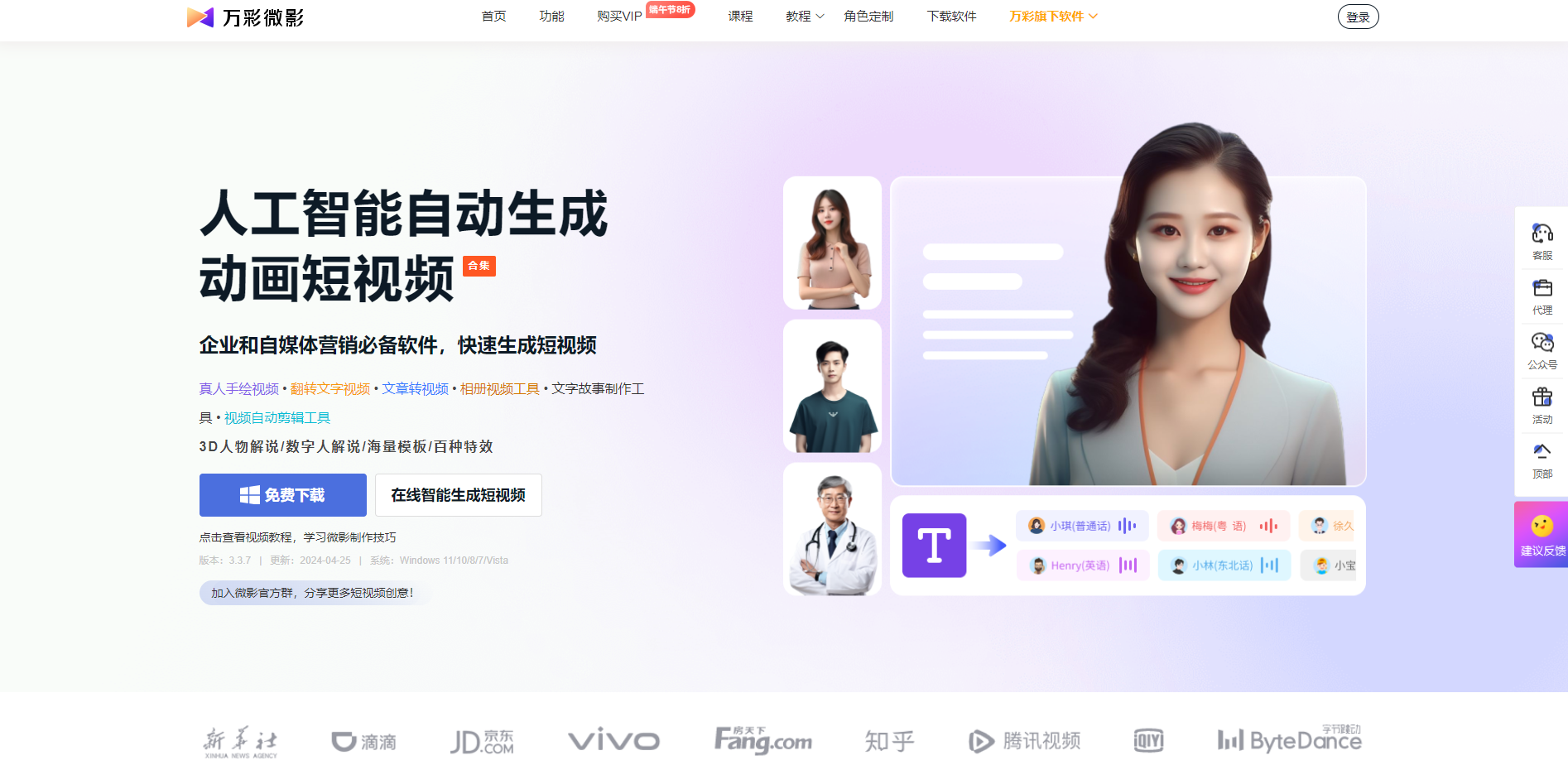 万彩微影作为一款人工智能生成短视频工具,为用户提供了快速、高效的短视频制作体验。它具备多种AI视频生成功能,如真人手绘视频、3D人物解说/数字人解说、翻转文字视频、文章转视频和相册视频工具等,可以满足用户在短视频制作中的不同需求。