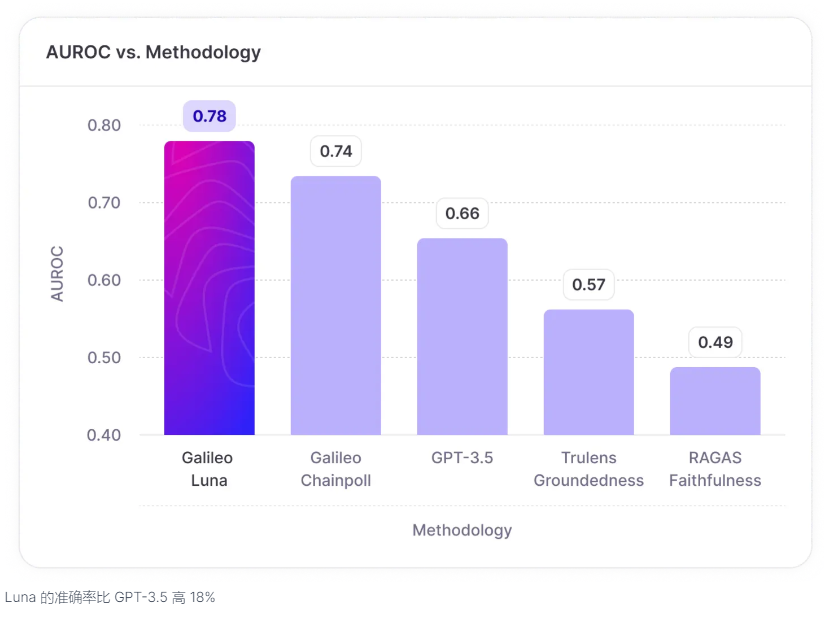 在性能上,Luna展现出了令人瞩目的优势。在接收器操作特征曲线下面积(AUROC)得分的基准比较中,Luna以0.78的高分超越了GPT-3.5、Trulens Groundedness和RAGAS Faithfulness等竞争对手,证明了其在评估企业生成式人工智能系统准确性方面的卓越能力。