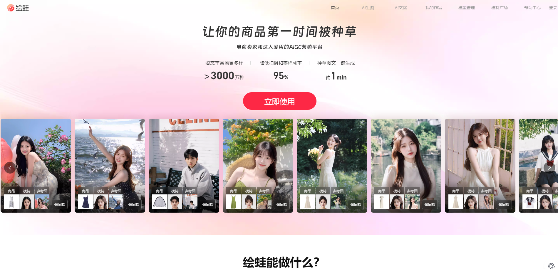 对于电商卖家和时尚达人而言,高质量的图片与吸引人的文案是吸引顾客、提升销量的关键。绘蛙,作为一款面向电商卖家的AI创作平台,以其低成本、高效率的特性,成为了众多商家的首选。