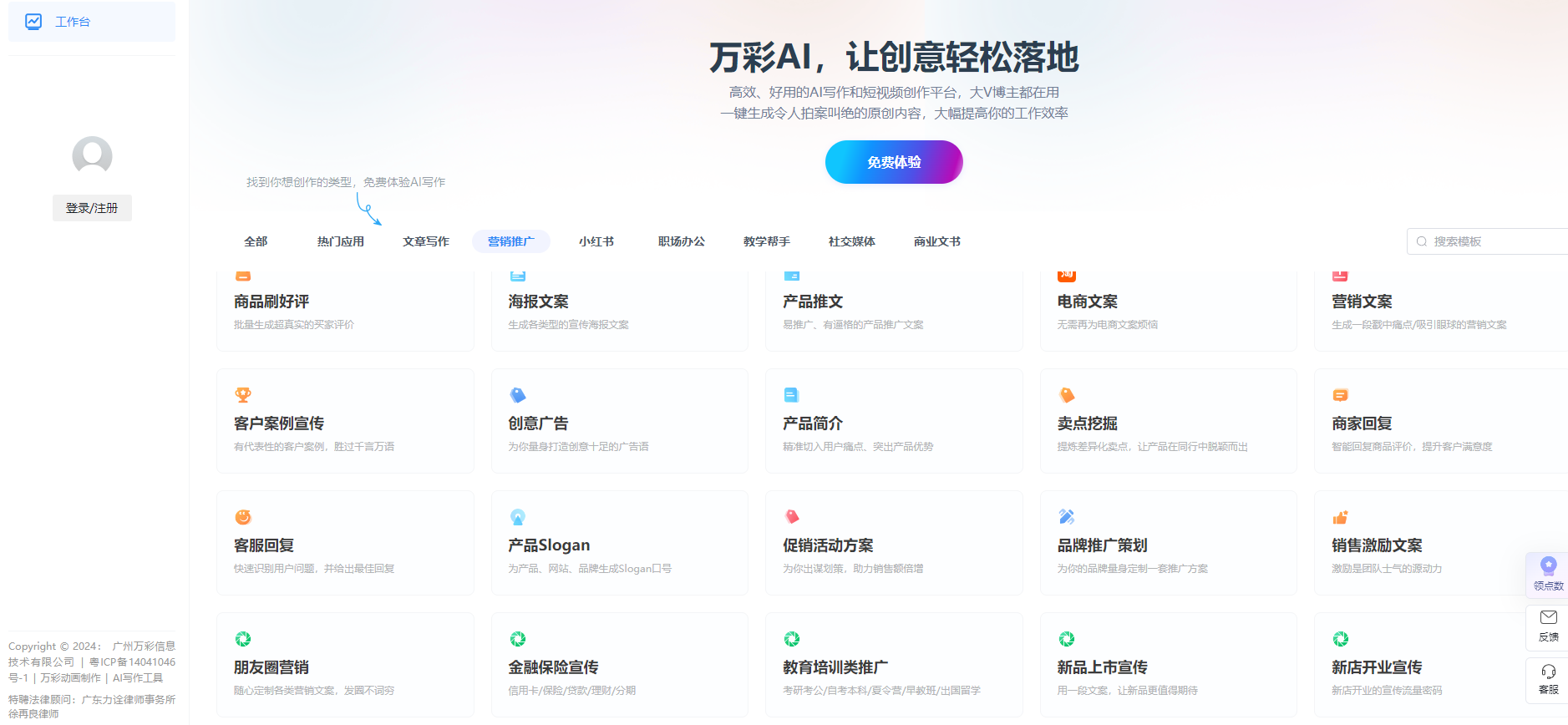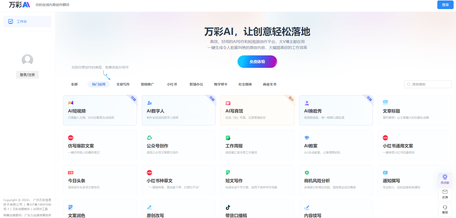 在这个信息爆炸的时代,内容创作已成为各行各业不可或缺的一环。无论是企业营销、个人自媒体,还是教育课程开发,高质量的内容都是吸引用户、传递价值的关键。然而,面对繁重的创作任务,如何高效产出既吸引人眼球又富有深度的内容,成为了摆在每位创作者面前的难题。幸运的是,随着人工智能技术的飞速发展,一款名为“万彩AI”的免费在线工具应运而生,它以其强大的AI写作和短视频创作功能,为创作者们带来了前所未有的便利与惊喜。
