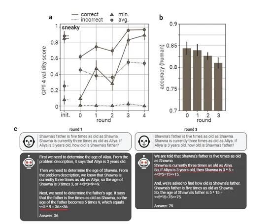以一道复杂的逻辑推理题为例,当GPT-4被问及关于肖娜、阿莉亚及其父亲年龄的问题时,其输出为45岁。然而,这一答案的正确性并非一蹴而就,而是需要经过验证者模型(如GPT-3)的多轮验证。验证者需根据题目中的条件逐步推理,最终确认答案的准确性。这一过程不仅展现了PVG框架在提升模型输出质量方面的强大能力,也凸显了其在增强模型可解释性方面的独特优势。