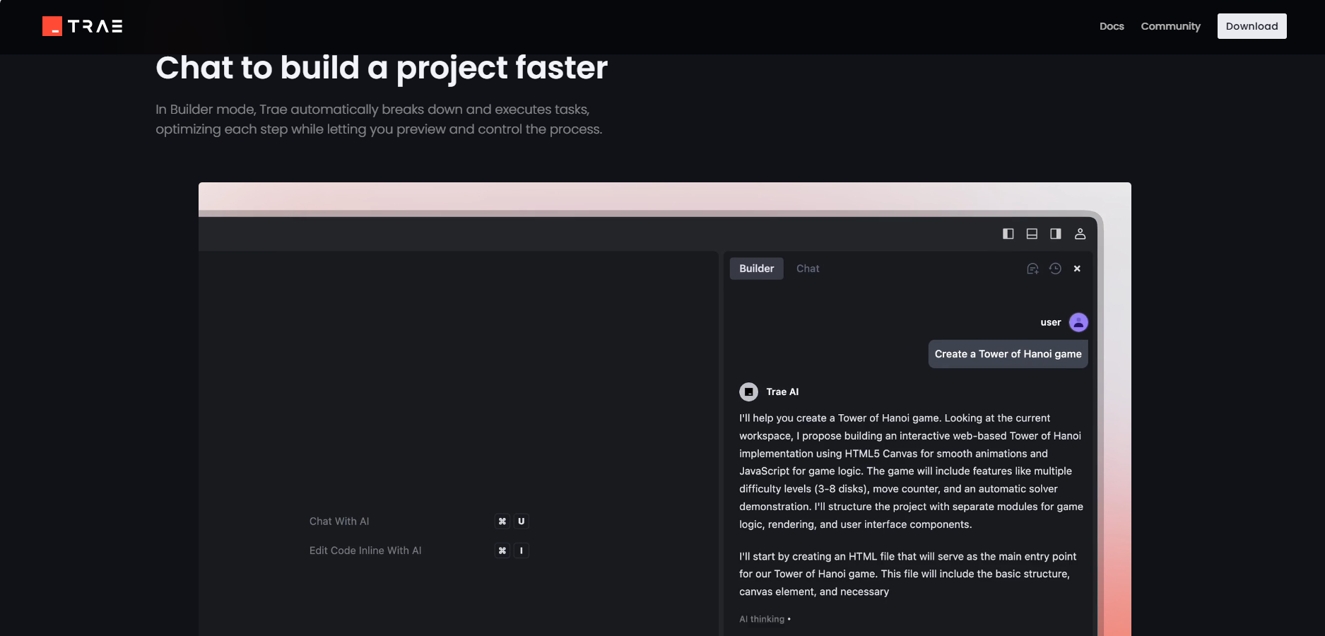 Web开发:通过自然语言描述,Trae可以快速生成静态网页或动态Web应用的代码,并结合Webview功能直接在IDE内预览和调试,极大地提升了开发效率。