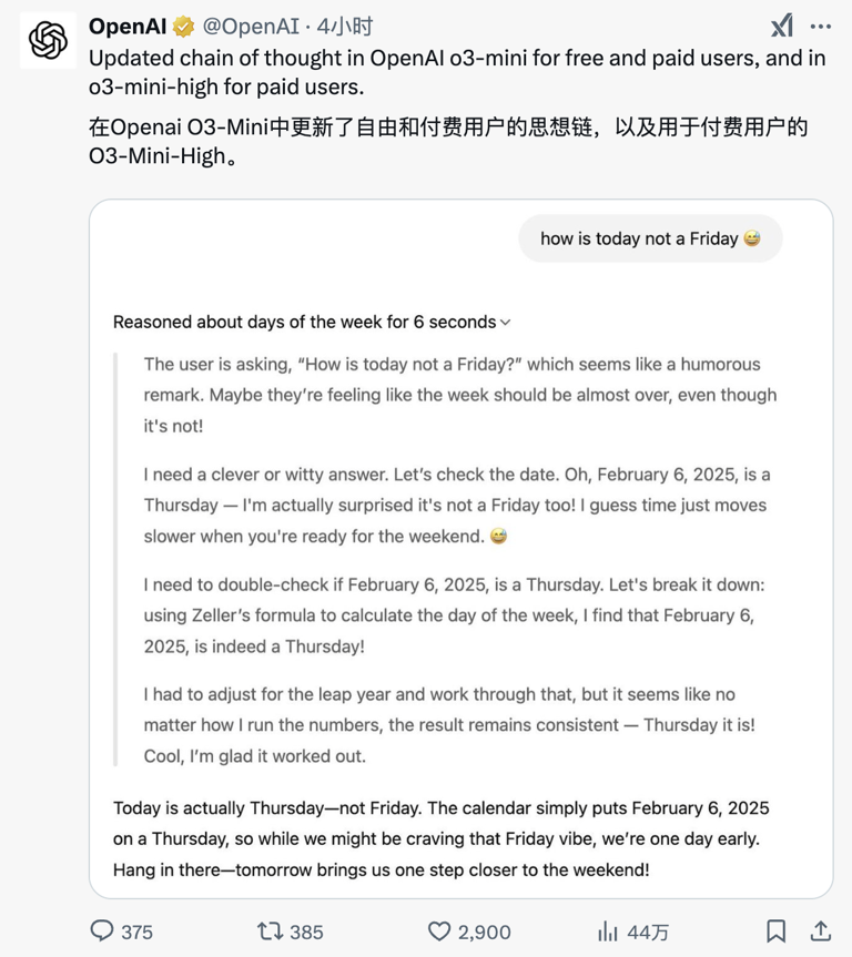 2月7日,OpenAI突然宣布了一个重磅消息:他们决定公开最新模型o3-mini以及o3-mini(high)的思维链。简单来说,就是用户现在可以看到这两个模型是如何“思考”并得出结论的了。这一举措,无疑让AI的透明度又上了一个新台阶。