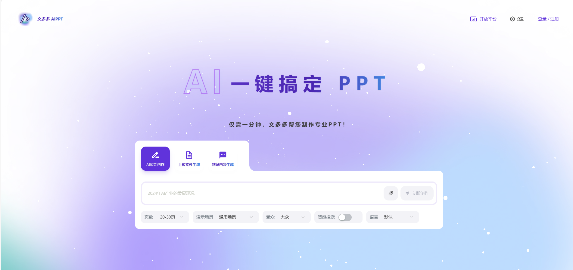 文多多AiPPT的核心优势在于其强大的AI内容生成能力。用户只需输入主题或相关文档,AI就能智能分析并生成符合主题的演示内容。这不仅大大节省了手动编辑的时间,还能确保内容的准确性和专业性。无论是商业报告、学术论文,还是教学课件,文多多AiPPT都能轻松应对。