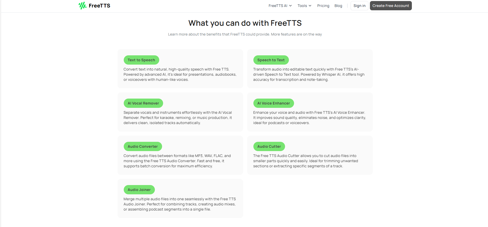 最重要的是,Freetts是一款完全免费的工具。用户无需支付任何费用,即可享受所有功能和服务。这种免费的使用体验,无疑为Freetts赢得了大量的用户和好评。